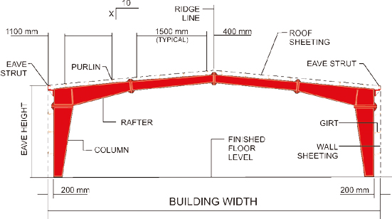 - Eave struts located at the building eaves (corner of roof and wall sheeting along sidewalls also providing)